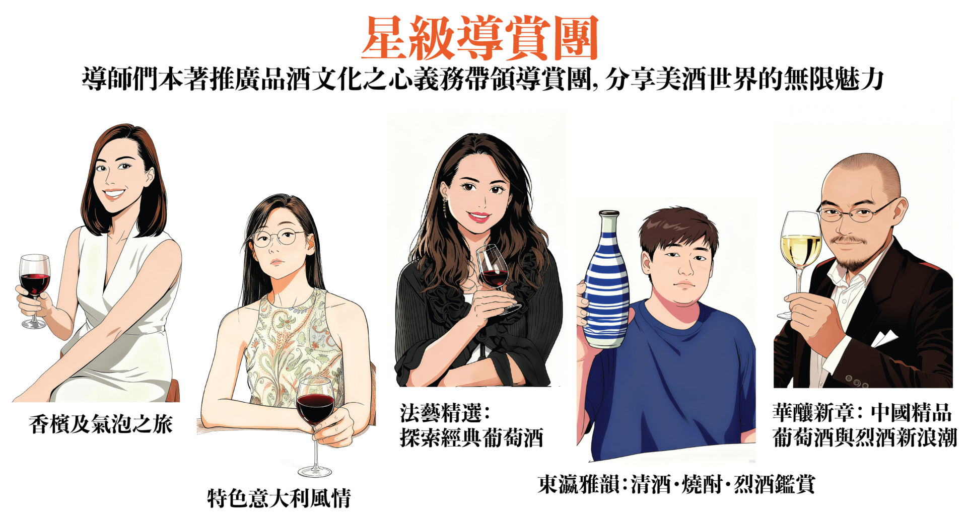 ➤ 5大主題導覽:(1) 東瀛雅韻:清酒・燒酎・烈酒鑑賞 (2) 華釀新章: 中國精品葡萄酒與烈酒新浪潮 (3) 法藝精選:探索經典葡萄酒 (4) 香檳及氣泡之旅 (5) 特色意大利風情